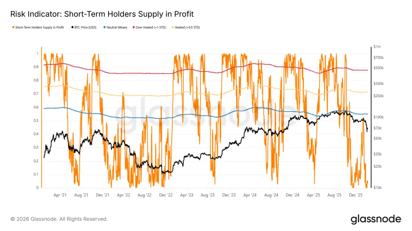 短期保有者の利益率指標は、その判断に役立つ。過去の熊市反発では、この指標が「平均値+0.5標準偏差」の範囲に達した時点で、価格は停滞しやすい。現在、この数値は4.9%と低く、多くの買い手が未だ含み損状態にあることを示す。利益確定者は少なく、売り圧力は限定的だが、市場の弱さも示しており、新規資金の流入も乏しいため、反発は長続きしにくい。