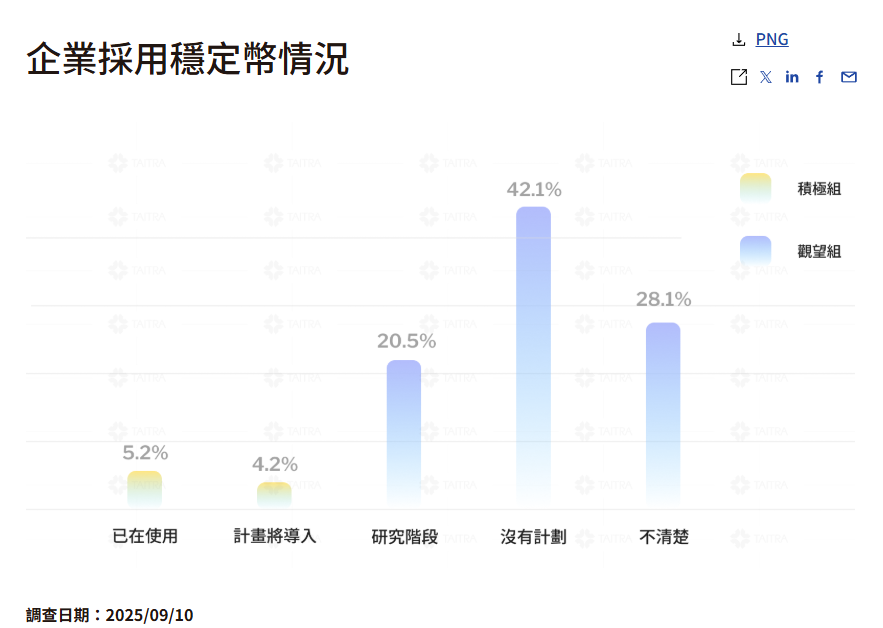外国貿易協会の統計によると、2025年9月時点で調査したところ、すでに5.2%の企業がステーブルコインを使用しており、さらに4.2%が導入を計画しています。 この合計約10%の利用率は、ステーブルコインが実験段階を超え、貿易決済の初期段階に入ったことを示しています。特に台湾の商人の利用率は高い傾向にあります。