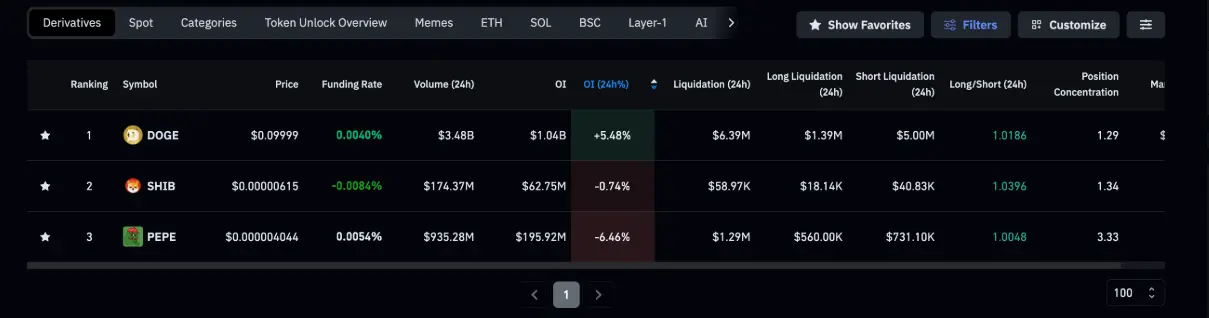 CoinGlassのデータによると、Dogecoinの未決済建玉(OI)は木曜日に10億4000万ドルに達し、24時間で5.36%増加した。これは、新たな資金流入と個人投資家からの需要が高まっている明確な兆候である。一方、Shiba InuとPepeは市場の回復に追いつくのに苦戦し、個人投資家の関心を再燃させることができていない。SHIBのOIは約6275万ドル(ほぼ横ばい)、PEPEは1億9592万ドルで、いずれも同期間中に6%以上減少している。
