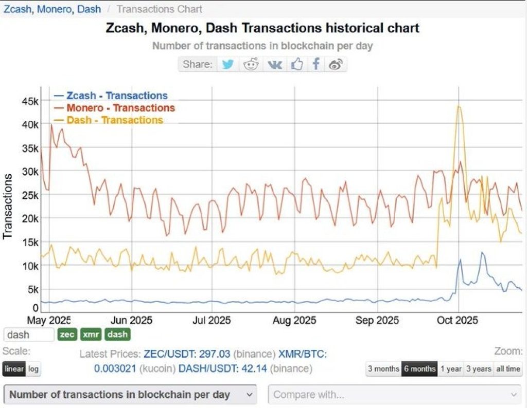 これは小さな差ではありません。モネロはZcashの約4倍から6倍のオンチェーン取引を処理しています。そして、そのパターンは何年も一定です。