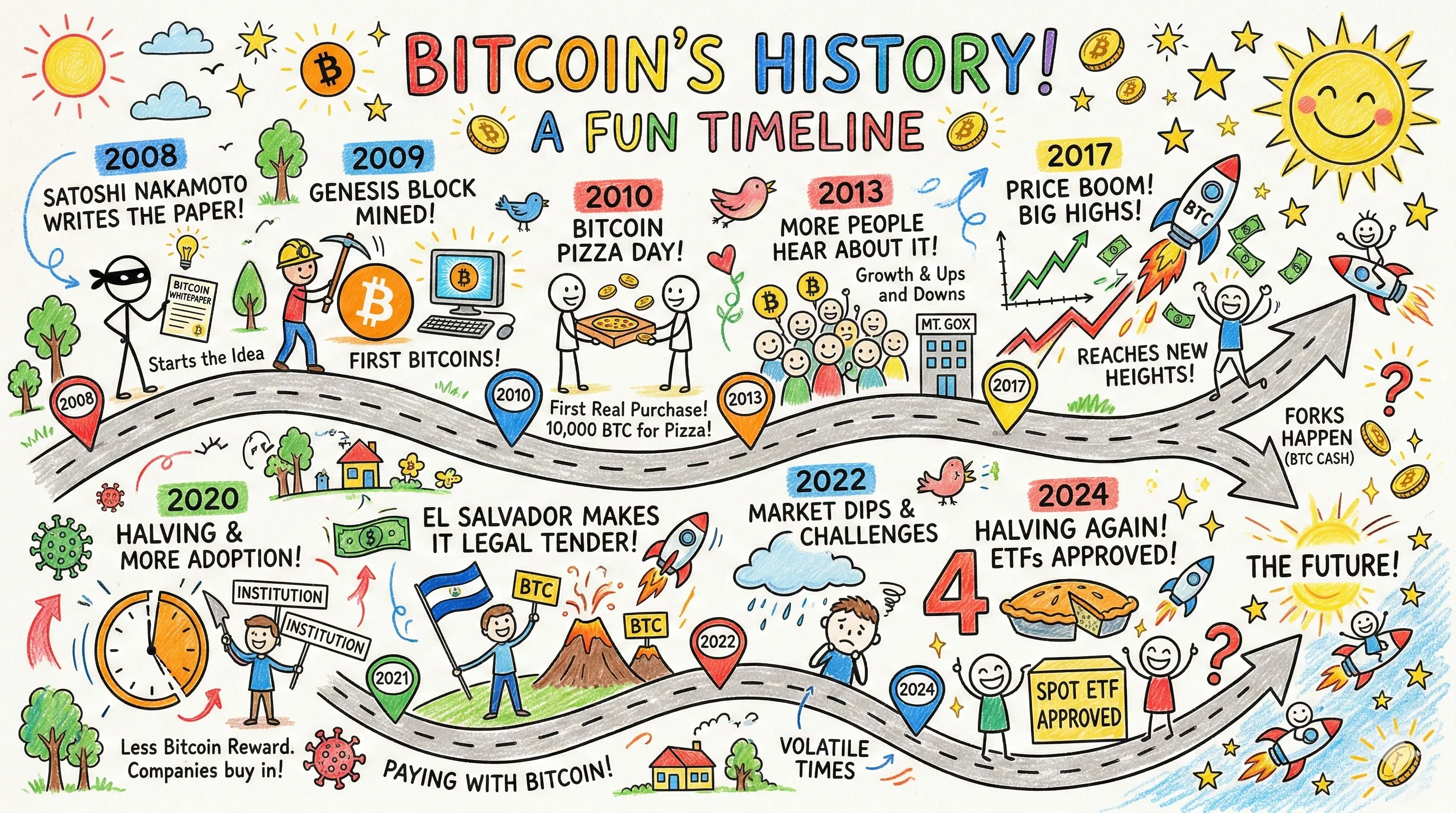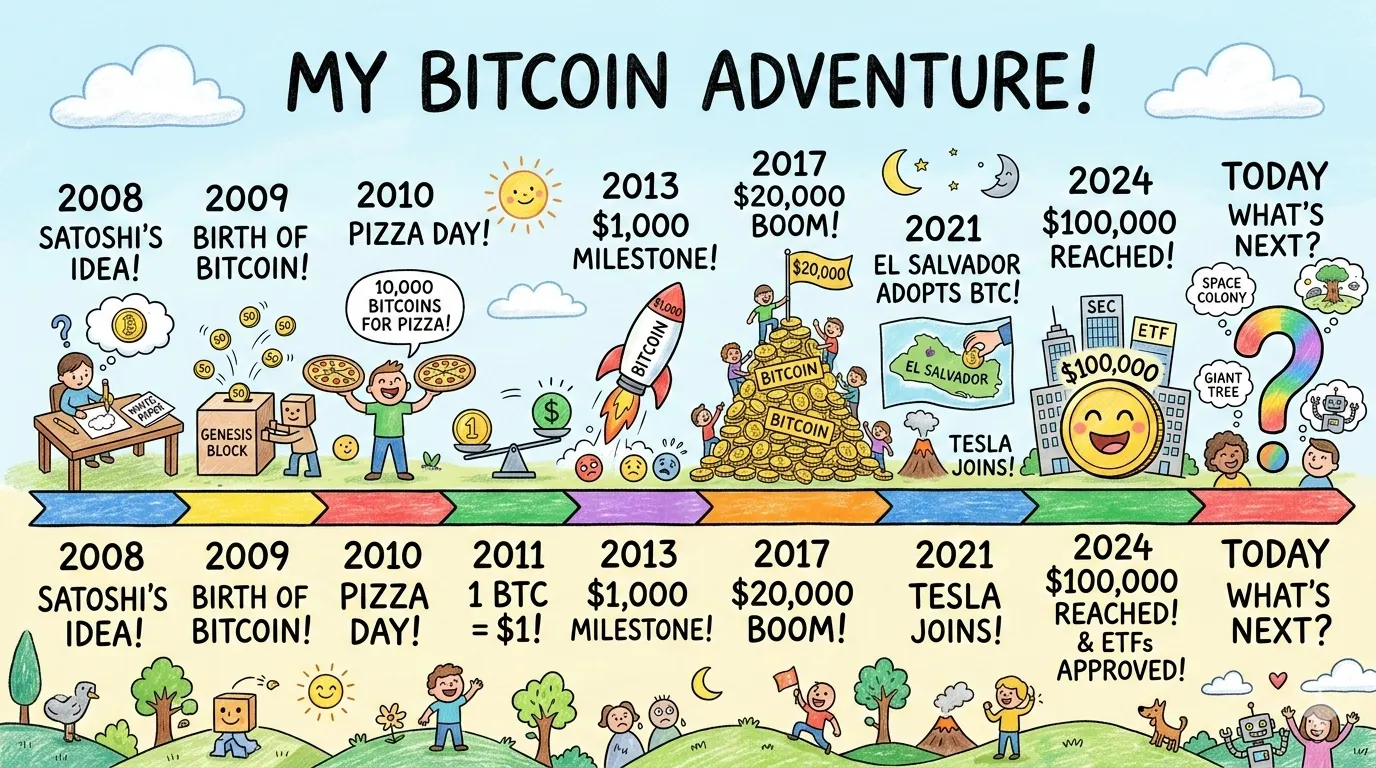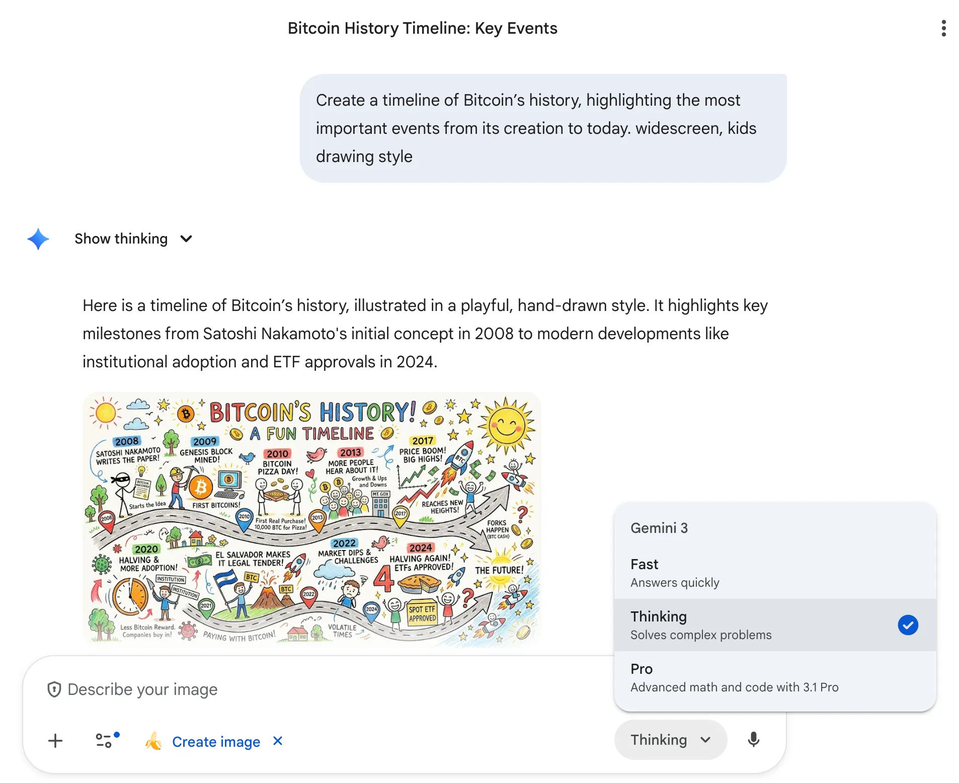 例として、「ビットコインの歴史のタイムラインを作成し、創設から今日までの重要な出来事をハイライトしてください。ワイドスクリーン、子供の描き方スタイル」という指示に対して、Thinkingモードで生成された結果がこちら。