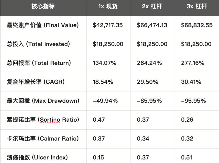 When weighing risk, return, and practical execution, spot DCA stands out as the most effective long-term approach. 2x is the practical ceiling; 3x simply isn’t worth it.