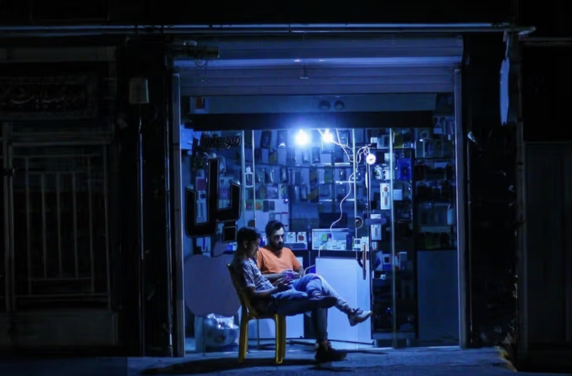Image description: Two Iranian men sit outside their cell phone shop, lit only by an emergency lamp as a blackout leaves the street in darkness.