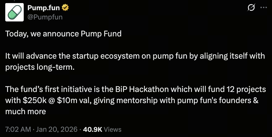 Through the “Build in Public” hackathon, Pump.fun combines funding, token issuance, and open development to create a highly market-oriented early investment model. This is more than a hackathon—it’s a public testing ground to determine which products truly merit development, funding, and market adoption. It also highlights Pump.fun’s ongoing evolution from meme coin infrastructure into an essential on-chain hub for entrepreneurship and market testing.