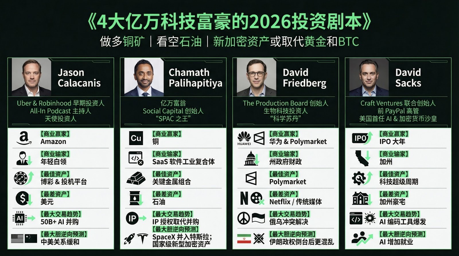 Leading Silicon Valley investors Jason Calacanis, Chamath, David Friedberg, and David Sacks have unveiled their definitive forecasts for 2026, addressing topics such as artificial intelligence, IPO cycles, prediction markets, critical metals, China–US relations, and global political and economic developments. This article distills 11 key insights, offering an in-depth analysis of the sectors and asset classes most worthy of full commitment in the year ahead.