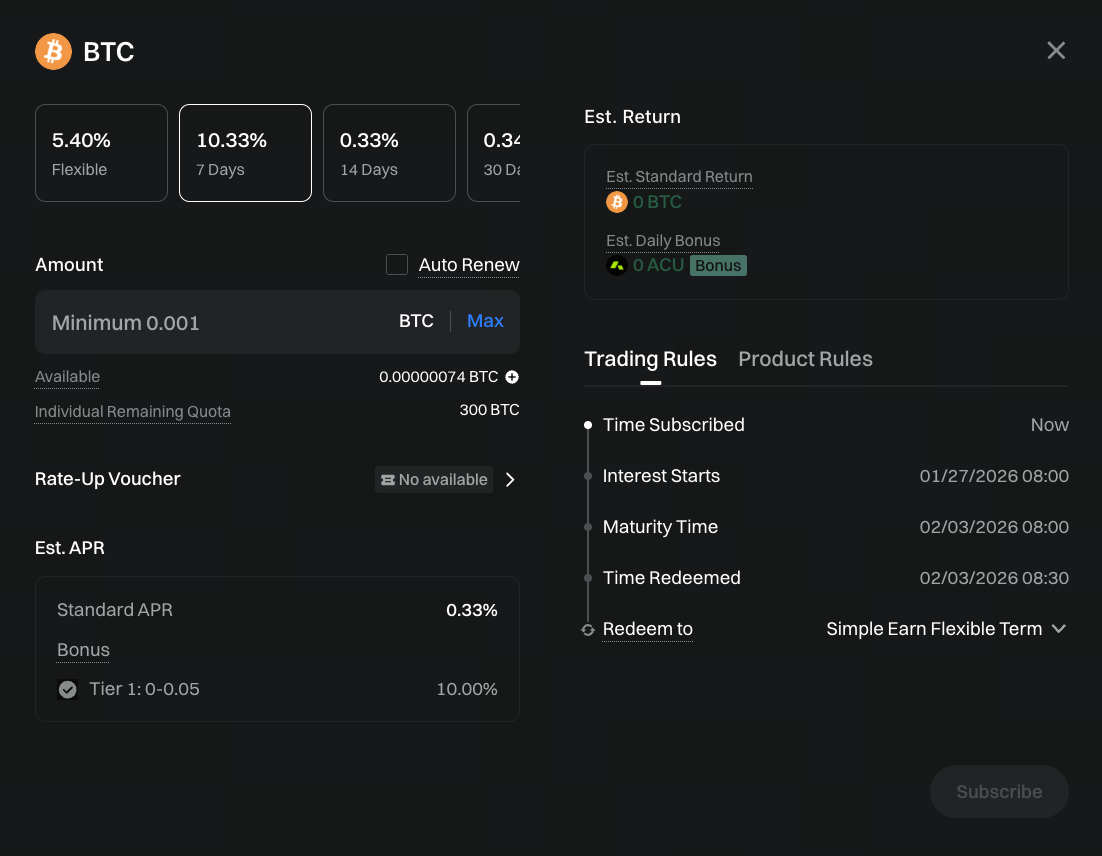 In January 2026, Gate launched the Simple Earn BTC 7-Day Fixed-Term ACU Bonus Event. In addition to the standard fixed-term yield, users who subscribe to the specified product receive an extra 10% annualized bonus, bringing the total annualized yield up to 10.3%.