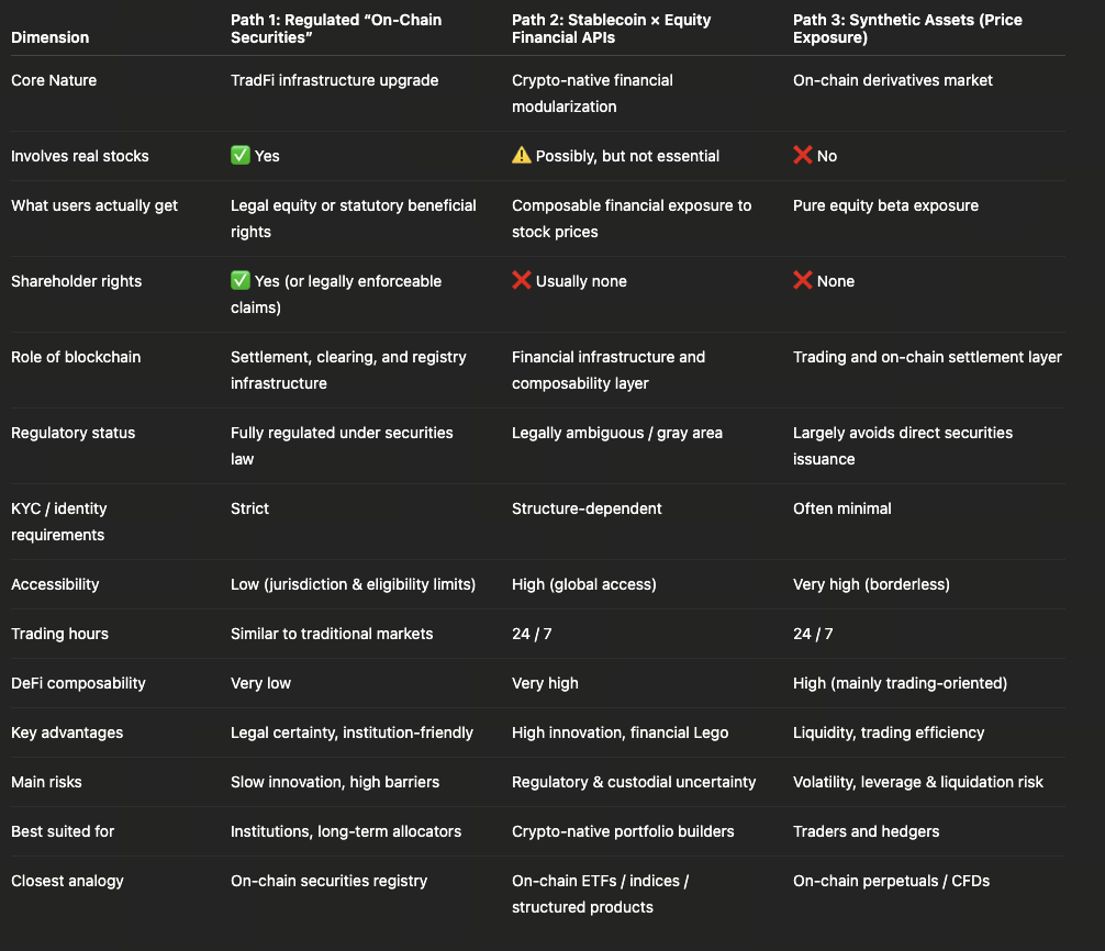 The fundamental difference between the three future paths for tokenized stocks isn’t technical—it’s whether you’re getting “actual equity,” “composable financial functions,” or “pure price exposure.”