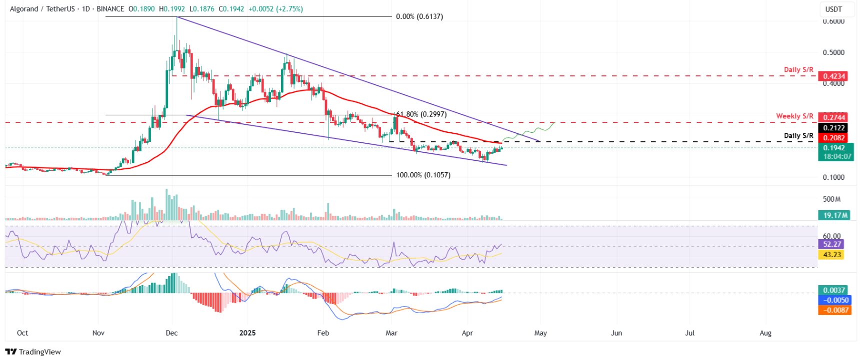 The price of Algorand (ALGO) has found a solid support around the lower trend line of the descending wedge pattern – formed by connecting the highs and lows since early December. From this support zone, ALGO surged strongly, recording an impressive recovery of 12.69% last week. The upward momentum continued in Monday’s trading with an additional increase of 3.36%. As of Tuesday morning, ALGO is being traded around the $0.19 mark, approaching the 50-day exponential moving average (EMA) at $0.20.