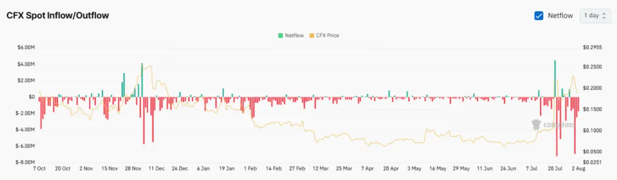 Data from CoinGlass shows that the accumulation trend has been steadily occurring over the past five days, with a total of 14.23 million USD worth of CFX being transferred into personal wallets.
