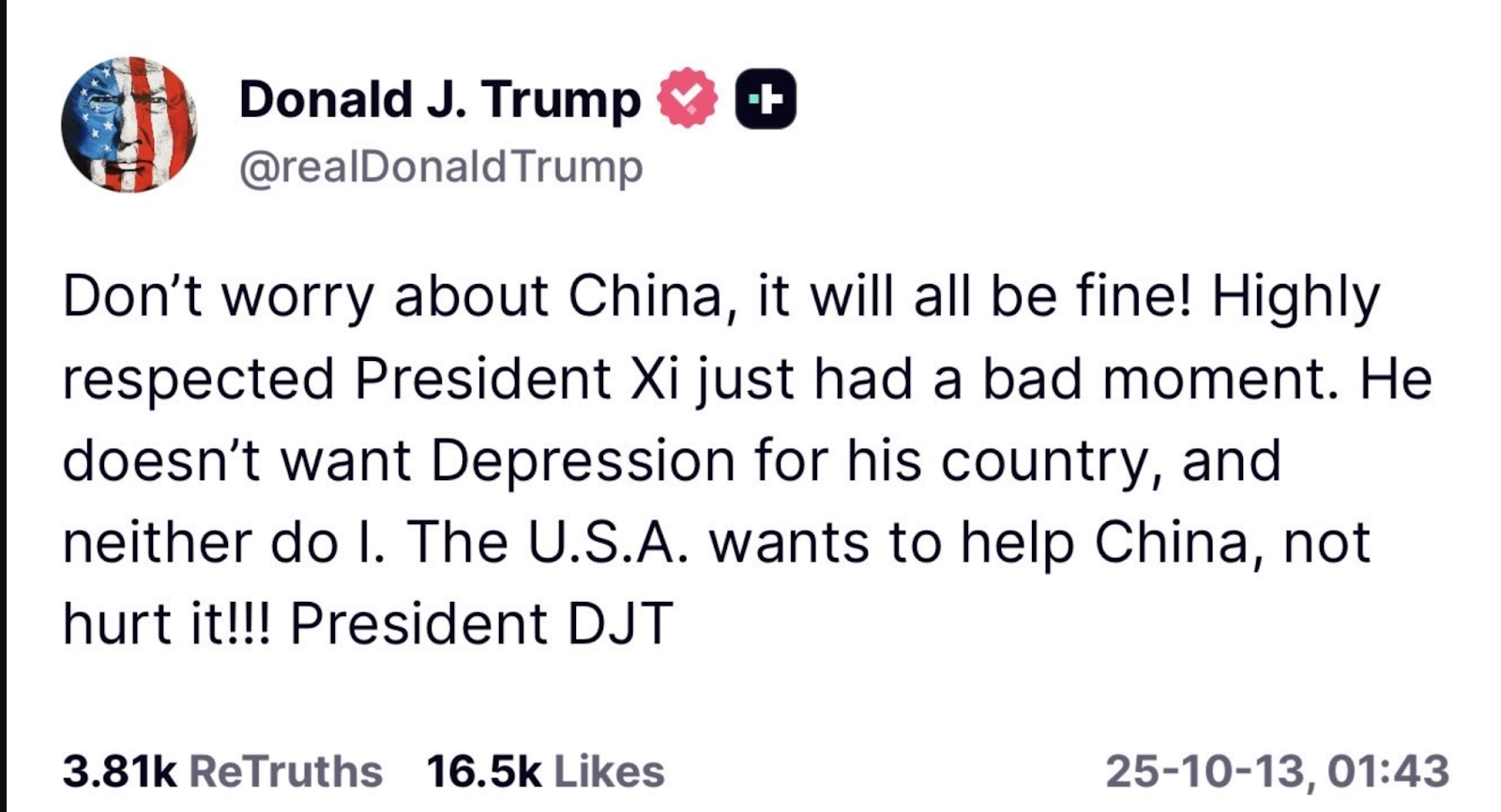 Source: Trump Truth Social post (left shows Trump threatening to increase tariffs, right shows Trump's easing stance).