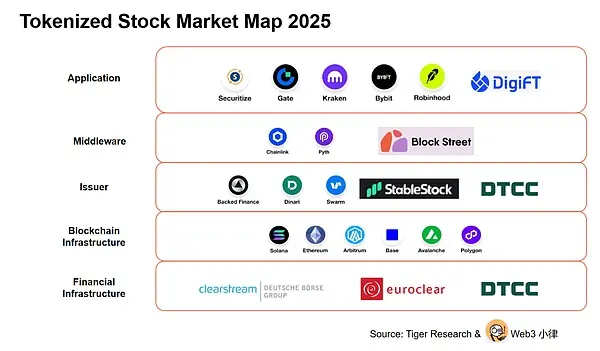 From the perspective of the on-chain US stock ecosystem, the entire stack can be roughly divided into: 1) the underlying traditional financial settlement layer & blockchain settlement layer (L1/L2); 2) on-chain stock issuers; 3) middleware (oracles, liquidity, compliance, etc.); 4) core trading scenarios; 5) and the DeFi layer built on top of trading.