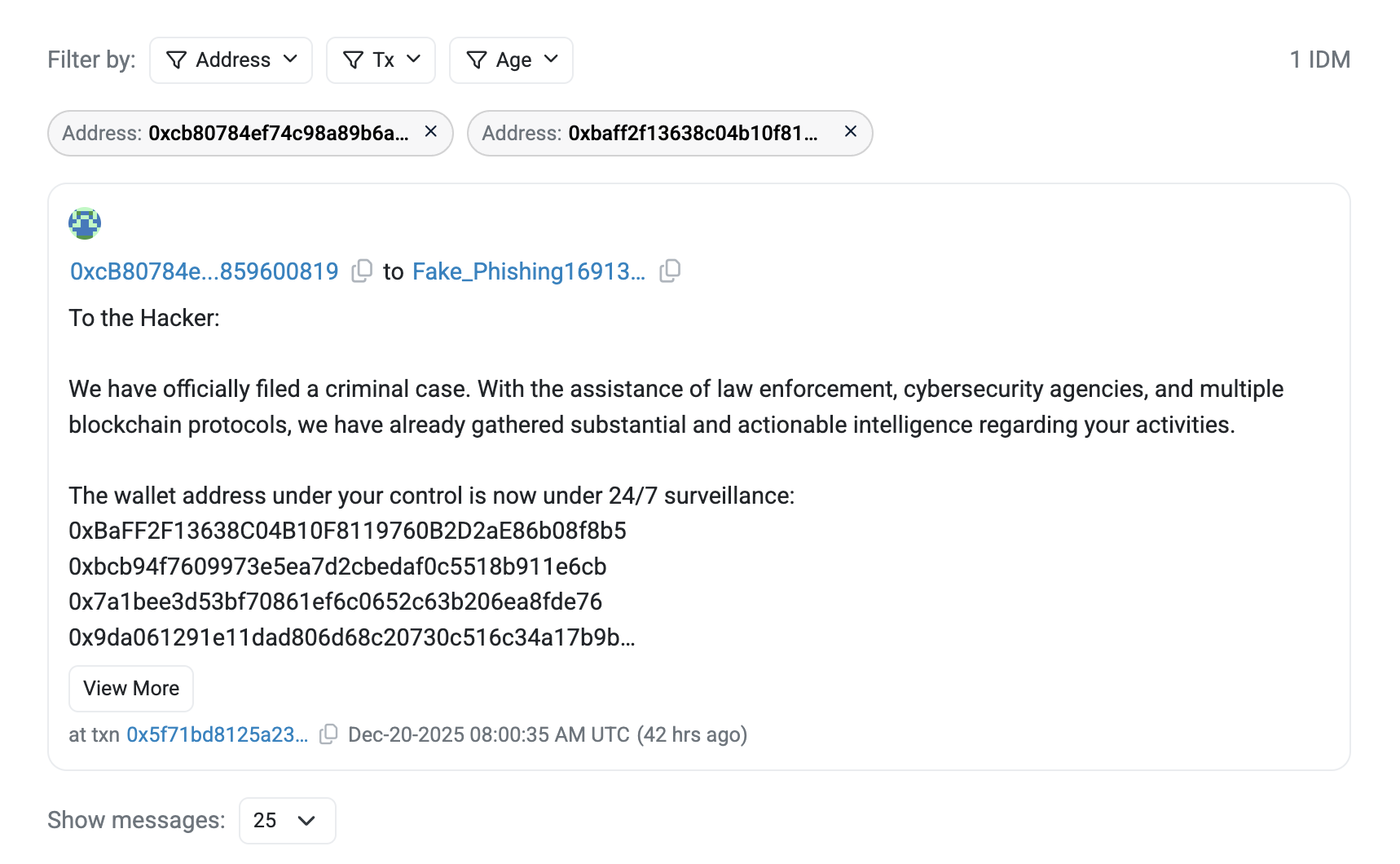 Source: Etherscan The victim left information on the chain, issuing a 48-hour ultimatum to the fraudster, demanding the return of 98% of the funds.