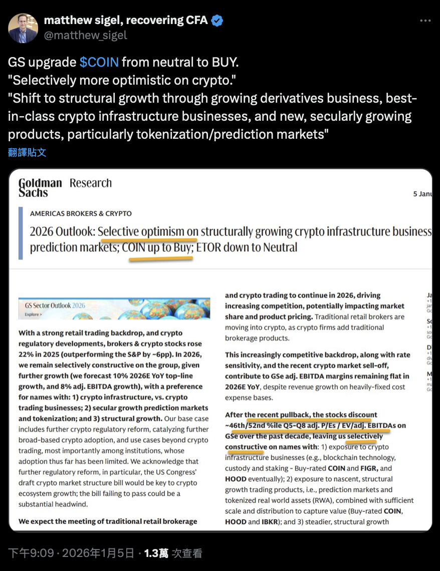 Goldman Sachs (GS) released a 2026 industry outlook report, officially upgrading Coinbase (NYSE: COIN) from “Neutral” to “Buy.” Goldman believes that, with Coinbase’s recent launch of a series of new products and a gradual shift in revenue structure towards more “infrastructure-like” businesses, the company’s growth prospects are more optimistic; however, in the short term, profits are still challenged by intensified competition and increased sensitivity to interest rates.