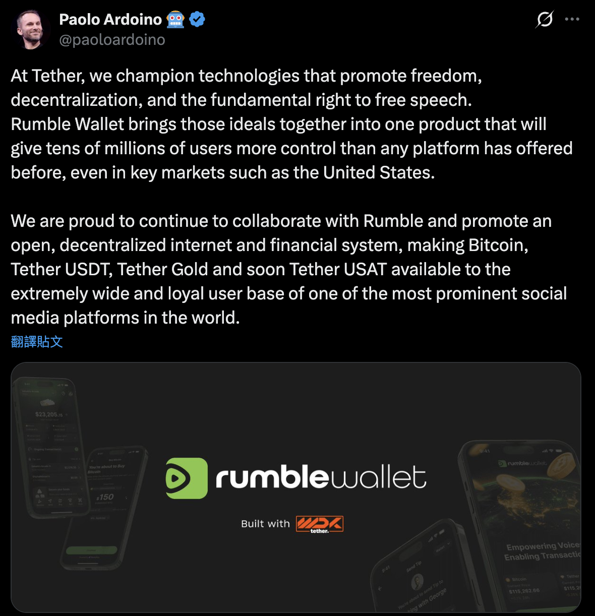 Image source: X/@paoloardoino Tether CEO Paolo Ardoino said that this partnership is an important step for Tether to extend wallet infrastructure from exchanges and DeFi scenarios to mainstream content platforms.