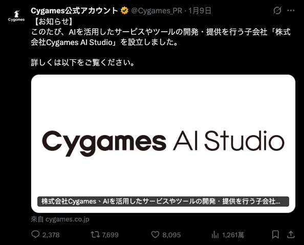 Cygames establishes an AI company! Developing proprietary game and animation AI models, currently recruiting AI vocalists
