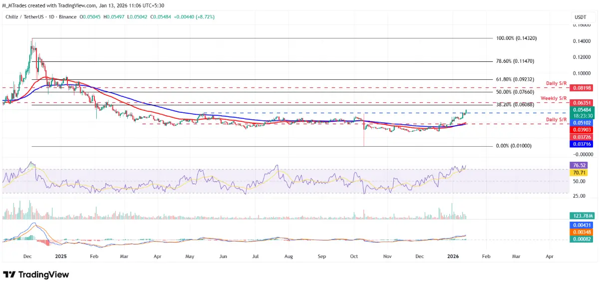 The Chiliz price broke out and closed firmly above the previous resistance zone at $0.039 on December 30, triggering a strong rally of nearly 30% over the next 11 days. However, the upward momentum temporarily stalled as CHZ faced slight resistance at the next daily resistance level around $0.051 on Sunday, leading to a short-term correction. By Tuesday, the altcoin quickly regained momentum, rising over 8% and surpassing the key resistance zone.