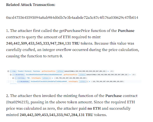 This event caused the native TRU token to lose all its value almost instantly. Security experts from SlowMist analysed the situation and found that a small mistake in the code led to this financial disaster.