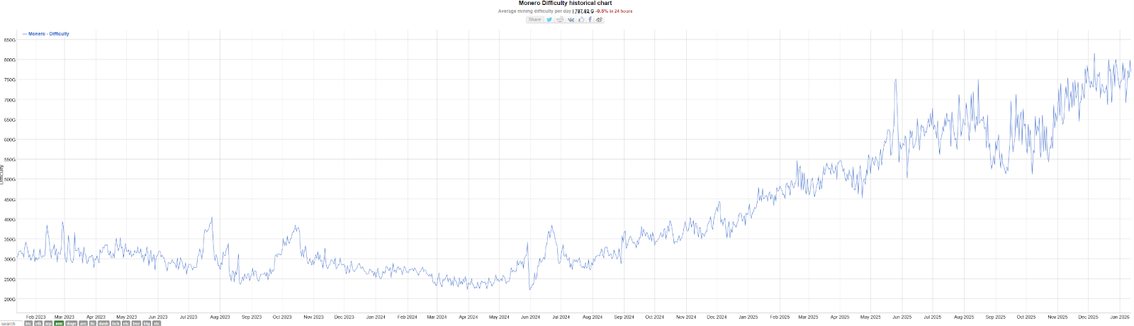 Before April 2025, Monero’s mining rewards experienced a clear decline. Coupled with the difficulty chart at that time, hash rate surged sharply while the coin price remained volatile. This divergence led to thinner rewards, possibly forcing some small miners with higher costs to exit the market. Data shows that mining difficulty briefly retreated in April, supporting this hypothesis.