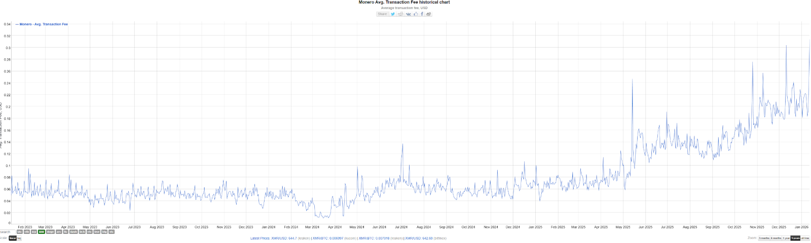 Because Monero has a dynamic block size adjustment mechanism, the spike in fees indicates that many users are trying to send transactions quickly and are willing to pay high fees to compensate miners for expansion costs. This indirectly proves that real transaction demand on the Monero chain has increased significantly since the second half of 2025.