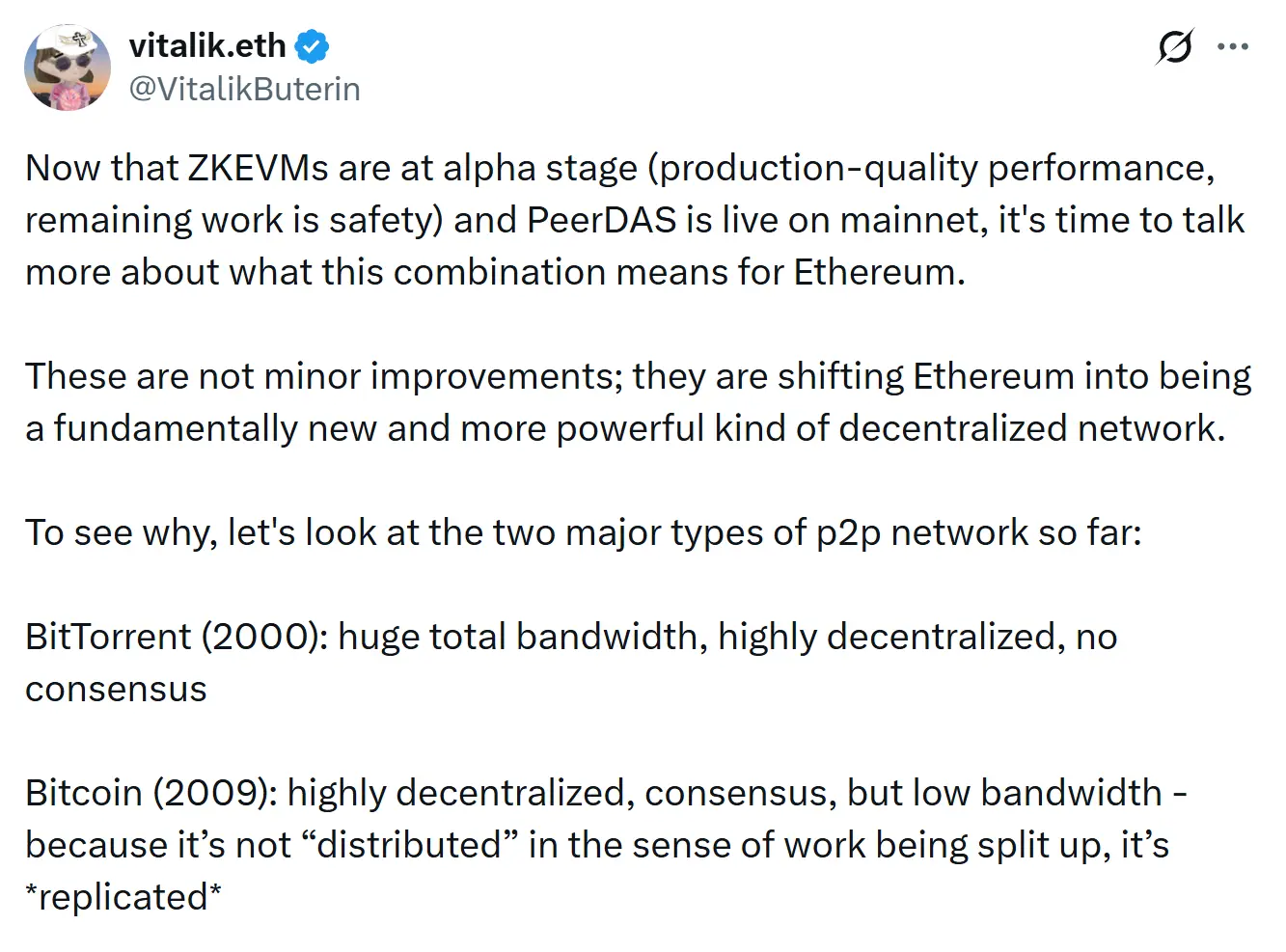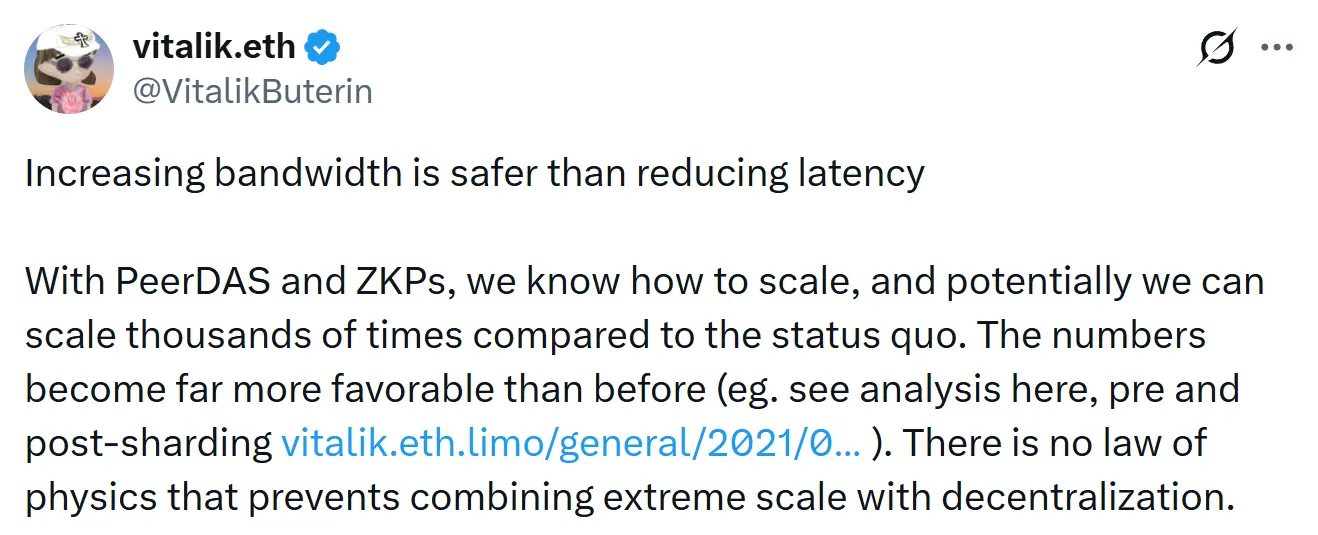 However, looking back from the beginning of 2026, we find that it seems to be gradually transforming into a “design threshold” that can be crossed through technological evolution, just as Vitalik Buterin pointed out in his disruptive view on January 8: "Compared to reducing latency, increasing bandwidth is safer and more reliable. With PeerDAS and ZKP, Ethereum scalability can be increased by thousands of times, and this does not conflict with decentralization."