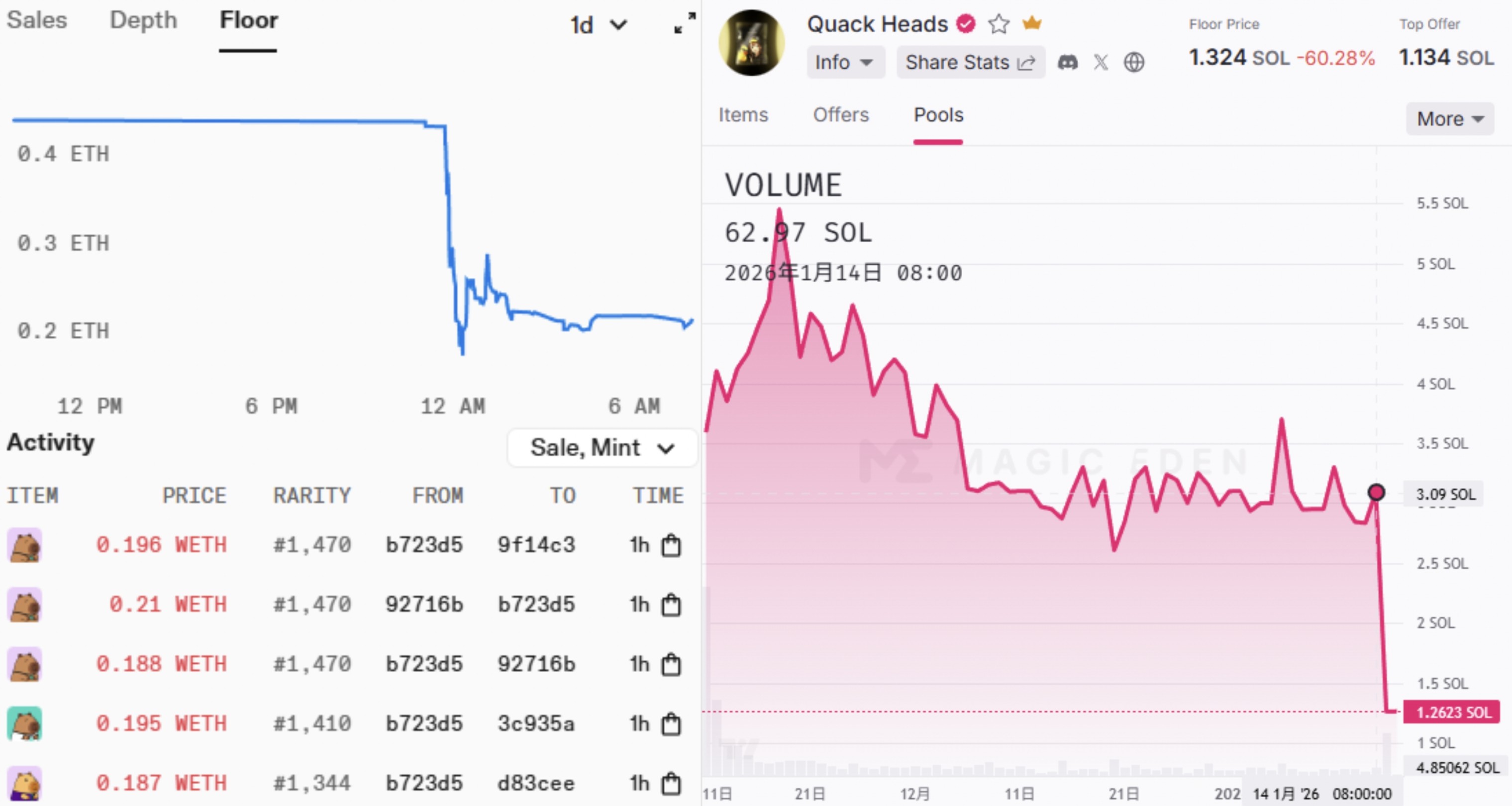Other related assets, such as Kaito’s Yapybaras NFT floor price, dropped about 50%, and Wallchain Quacks’ Quack Heads NFT floor price fell from 3 SOL to 1.2 SOL.