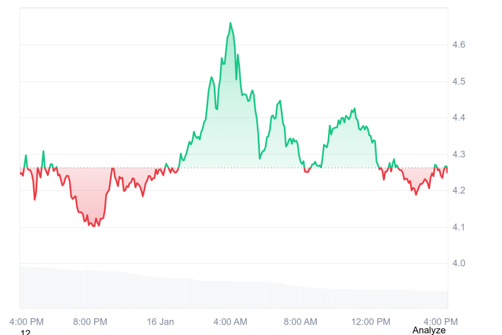Looking at the daily chart, the ICP price followed a familiar pattern. Prices slipped early and found a footing near the $4.10–$4.15 zone. ICP then accelerated as momentum took hold, pushing the price upwards towards the mid-$4.60s before the buyers ran out of steam.