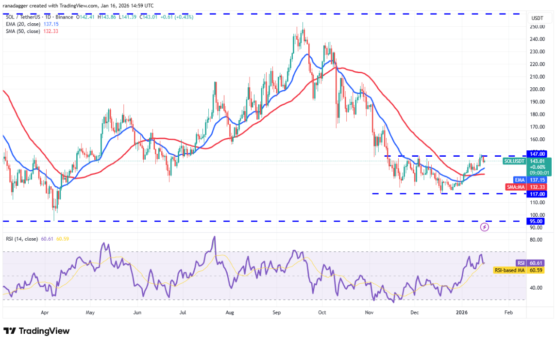 Daily SOL/USDT chart | Source: TradingView The 20-day EMA is sloping up at ($137), and the RSI is in the positive zone, indicating buyers are in control. This increases the likelihood that SOL will break above the resistance $147 and move towards $172.