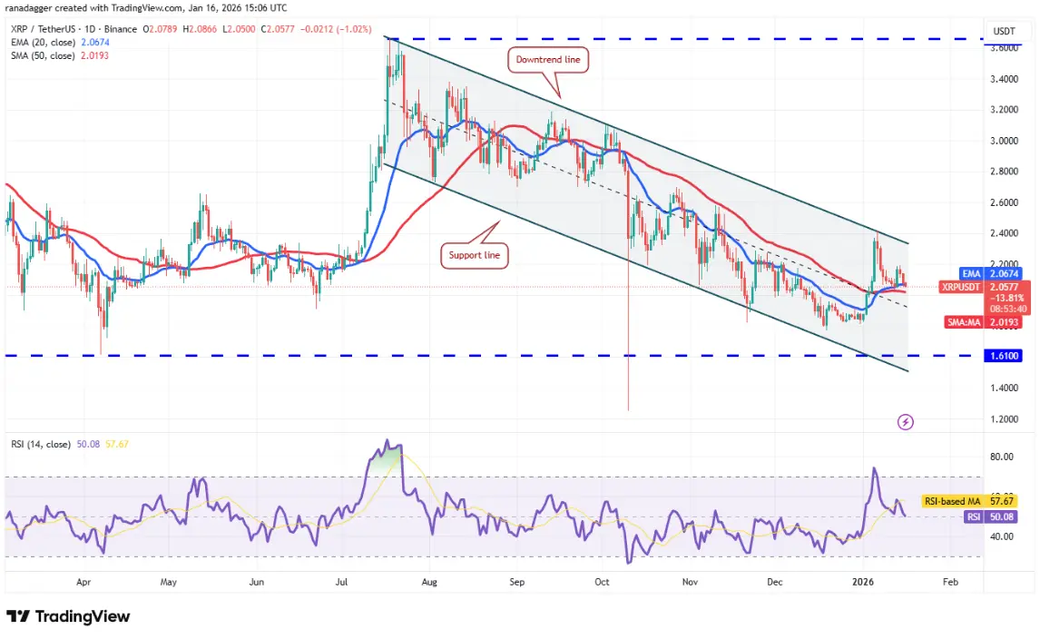 Daily XRP/USDT chart | Source: TradingView The bears will try to push the XRP price below the 50-day SMA at $2.01. If successful, the XRP/USDT pair could continue to oscillate within the downtrend channel for some more time.