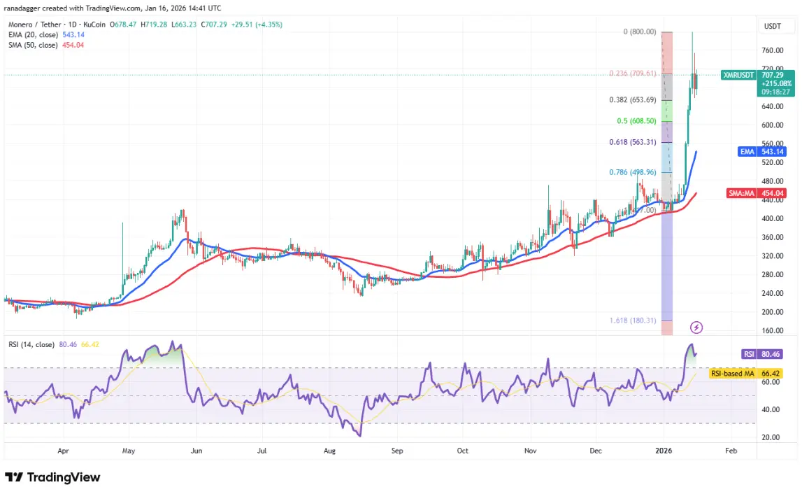 Daily XMR/USDT chart | Source: TradingView The correction is expected to find support at the 38.2% Fibonacci retracement level at $653 and lower at the 50% level at $608. If the price bounces back from these support zones, the bulls will continue efforts to push XMR/USDT above $800. If successful, Monero could resume its upward trend towards $1,000.