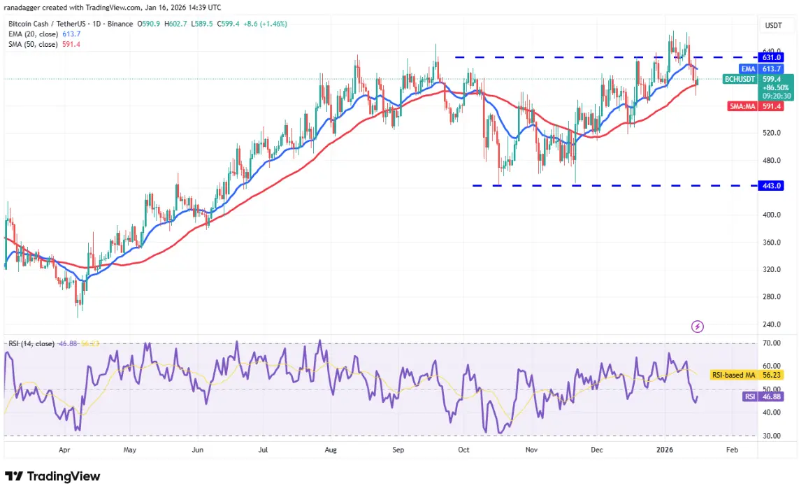 Daily BCH/USDT chart | Source: TradingView The 20-day EMA at (613 USD) is turning downward, and the RSI is in the negative zone, showing a slight advantage for the bears. If the price remains below the 50-day SMA at (591 USD), the BCH/USDT pair could decline to $563 and then to $518.