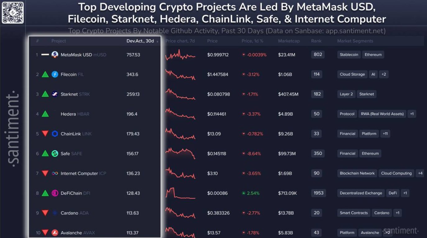 From a fundamental perspective, Filecoin continues to stand out as one of the most actively developed projects in the crypto ecosystem. According to recent data from Santiment, Filecoin currently ranks among the top three most active development teams, alongside MetaMask and Starknet.