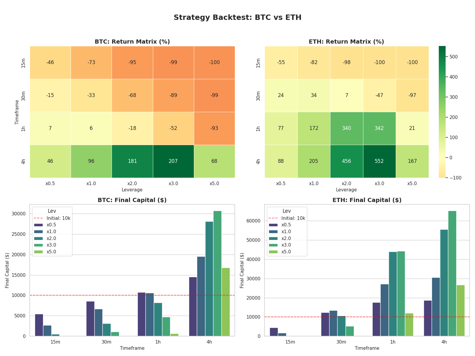BTC vs ETH: Pay attention to the ETH 4h bars at bottom right. When using x2.0 or x3.0 leverage, capital bars are extremely tall, far exceeding BTC’s performance, confirming ETH’s higher volatility in trending markets yields greater excess returns.