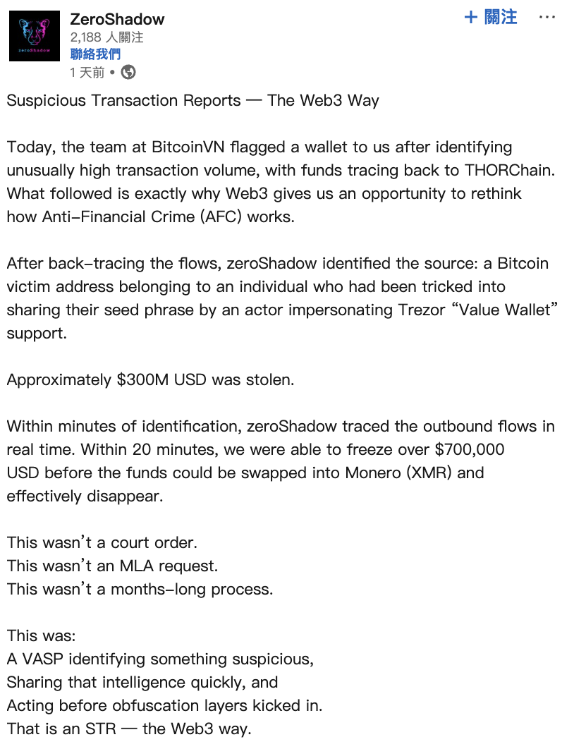 Image source: ZeroShadow Cybersecurity firm ZeroShadow states that within 20 minutes of the incident, they successfully identified and intercepted some of the flows, freezing about $700,000 of stolen funds before they were fully converted into privacy assets.