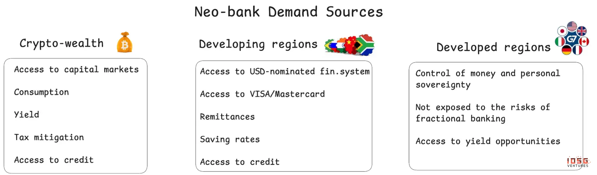Neobanks: Natural Beneficiaries of Stablecoin Adoption: The widespread adoption of stablecoins will fundamentally reshape banking, likely reducing the scale of traditional bank balance sheets and triggering chain reactions—though these are beyond this article’s scope. The key question: how will people manage their stablecoin balances? We believe this is unlikely to be done via personal wallets. Instead, Neobanks are poised to be the main beneficiaries of this trend. Understanding the opportunity requires understanding the demand sources and their nature.