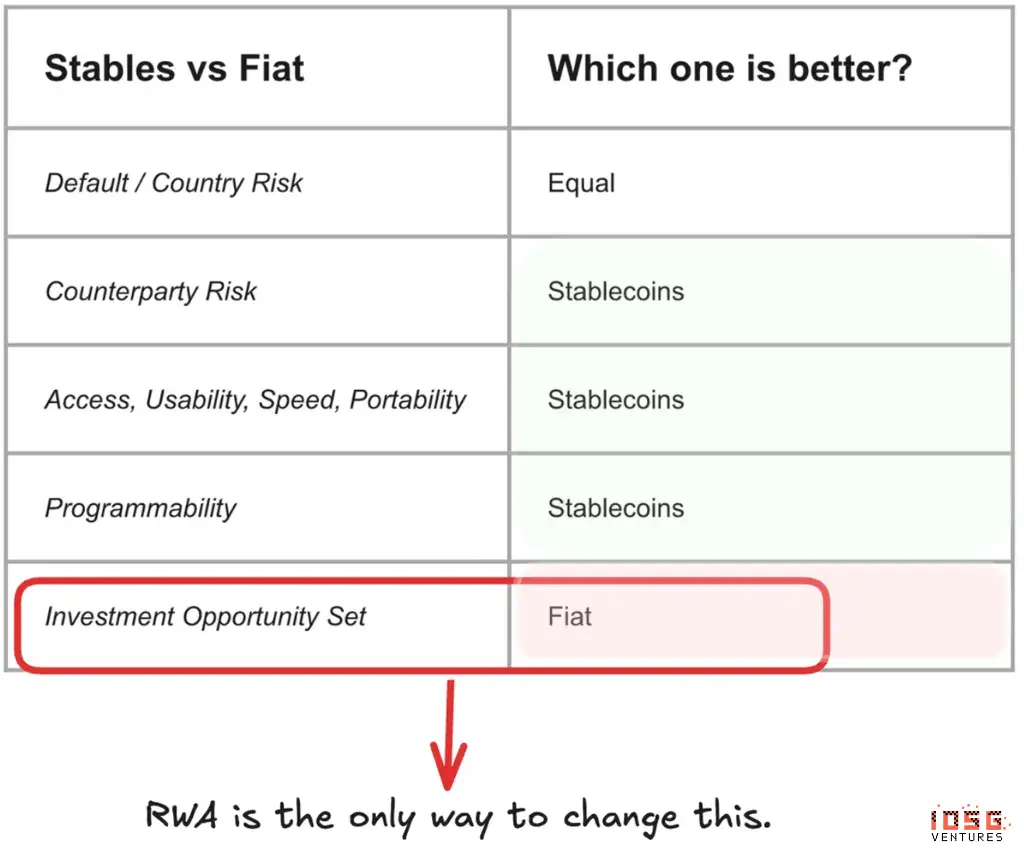 Stablecoins: Nearly Perfect Money, Missing a Key Link: Stablecoins have proven superior to traditional fiat in almost every dimension. Compared to traditional payment rails, they offer advantages in accessibility, usability, speed, portability, and programmability. Counterparty risk is comparable to traditional banking, and the technology itself provides clear advantages. However, a critical limitation remains: compared to fiat, stablecoins’ investment options are still limited. Traditional financial markets offer extensive productive investment opportunities—stocks, bonds, real estate, and alternative assets. Despite their technological advantages, stablecoins are constrained by crypto-native yield sources and investment opportunities, which alone cannot sustain a scale surpassing $1 trillion.
