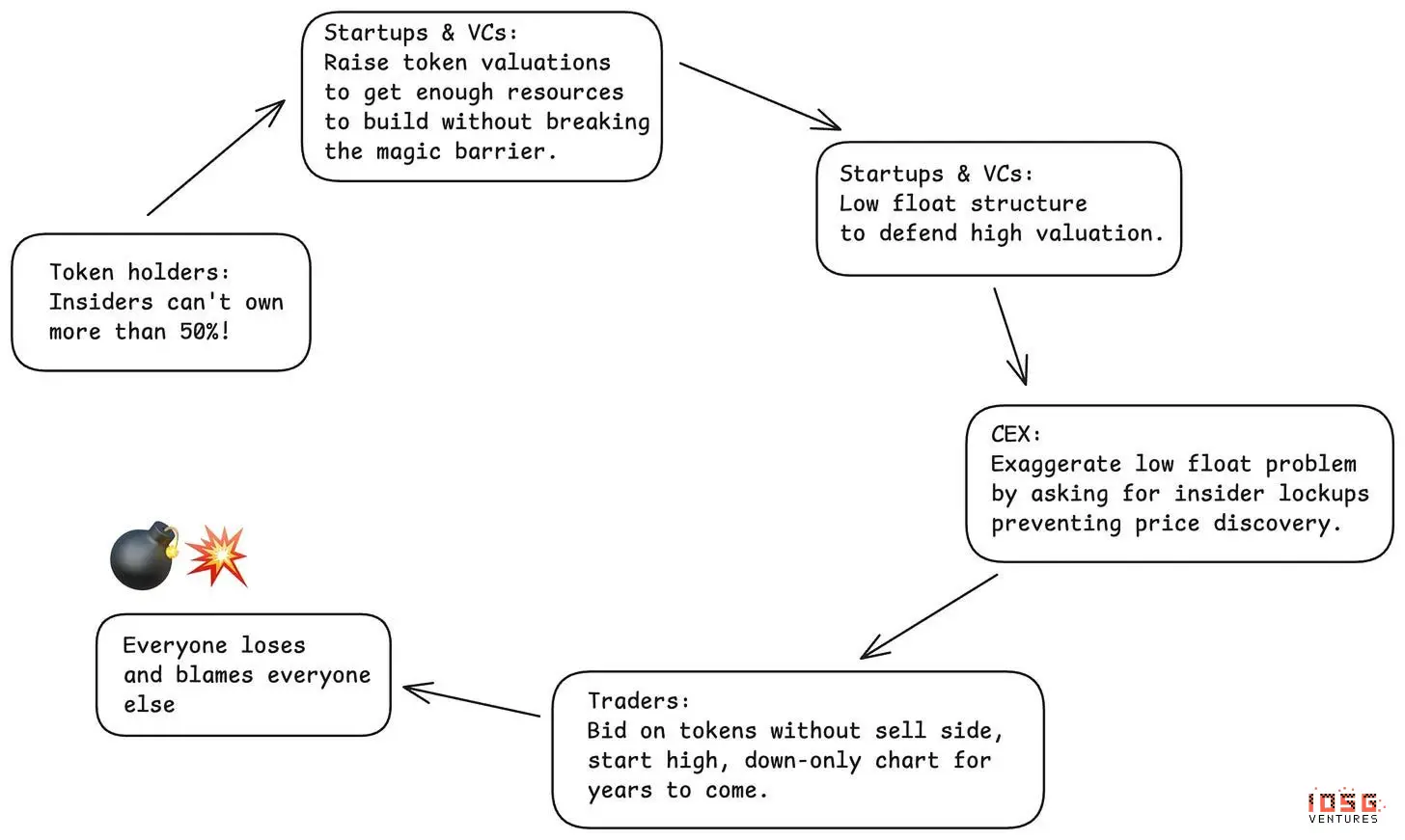 Especially cunning is that low circulation creates a situation where everyone thinks they are winning, but in reality, everyone is losing:#中心化交易所以为通过要求更低流通和更多控制来保护散户。结果却是面对愤怒的社区和糟糕的价格表现。# Token holders believe that maintaining low circulation prevents insiders from dumping. The result is that true price discovery is never achieved, and early supporters are penalized. When they demand insiders hold no more than 50%, it actually inflates primary market valuations to unreasonable levels, forcing insiders to use—yes—low circulation strategies to sustain these valuations.#项目团队以为低流通操纵能让他们合理化高估值和最小稀释。但总体而言,如果这一趋势持续,这种做法将摧毁整个行业的融资渠道。#VCs think they can value tokens based on low circulation holdings, raising more funds. But as the flaws become more apparent, in the medium to long term, funding channels dry up.