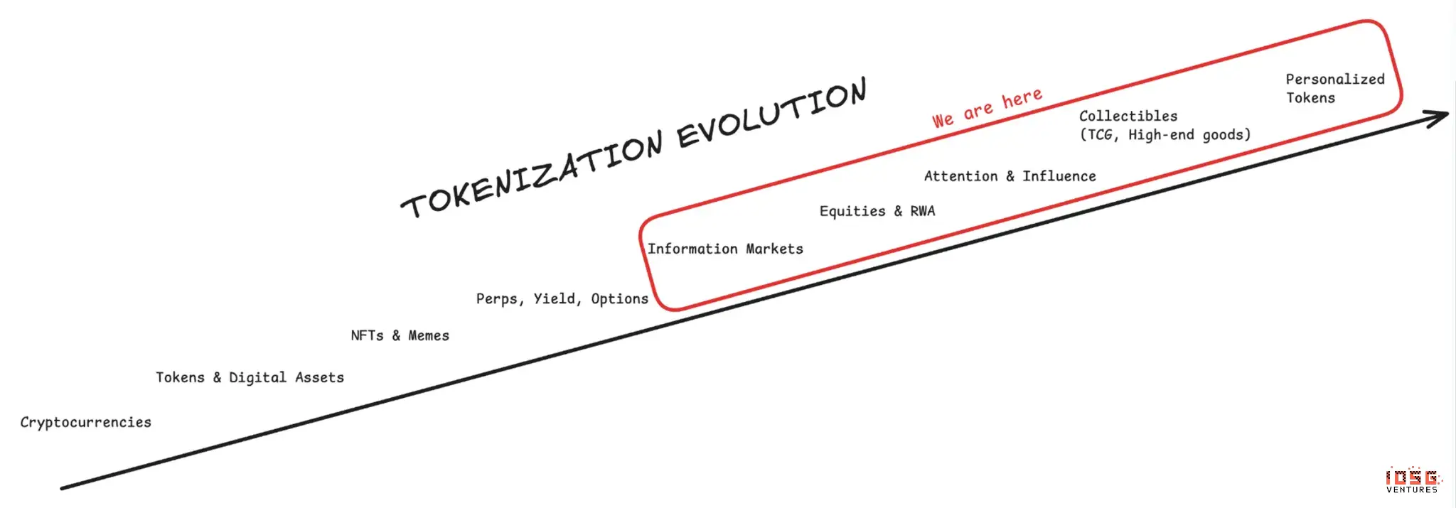 Internet Capital Markets: The Endgame of Tokenization: Blockchain technology enables a single, programmable global ledger, with capital flowing 24/7, and tokenization allowing any asset to be identified, traded, and settled instantly across borders. The evolution of tokenization has gone through different meta-cycles: from initial cryptocurrencies, to tokens (like altcoins and digital assets), to NFTs and Meme coins, then to information markets (prediction markets), and now to stocks, RWAs, and broad financial derivatives. Looking ahead, frontier areas include collectibles (trading card games, high-end goods), attention and influence markets, and ultimately personalized tokens. As each new narrative emerges, specialized trading infrastructure follows. Crypto trading has evolved from basic Bitcoin exchanges (Binance, OKX, Coinbase, Huobi) to on-chain DEXs (Uniswap), aggregators (1inch, 0x), NFT marketplaces (OpenSea), terminals (Blur), Meme launchpads (Pump.fun), terminals (Axiom, GMGN, FOMO), PerpDEXs (Hyperliquid, Lighter), and emerging prediction markets (Polymarket, Kalshi) with their own infrastructure. Each meta-narrative requires tailored interfaces for retail users seeking simplicity and professional users needing advanced features. The current generation (perpetual contracts and prediction markets) offers significant VC opportunities as the market matures and integrates with traditional finance.