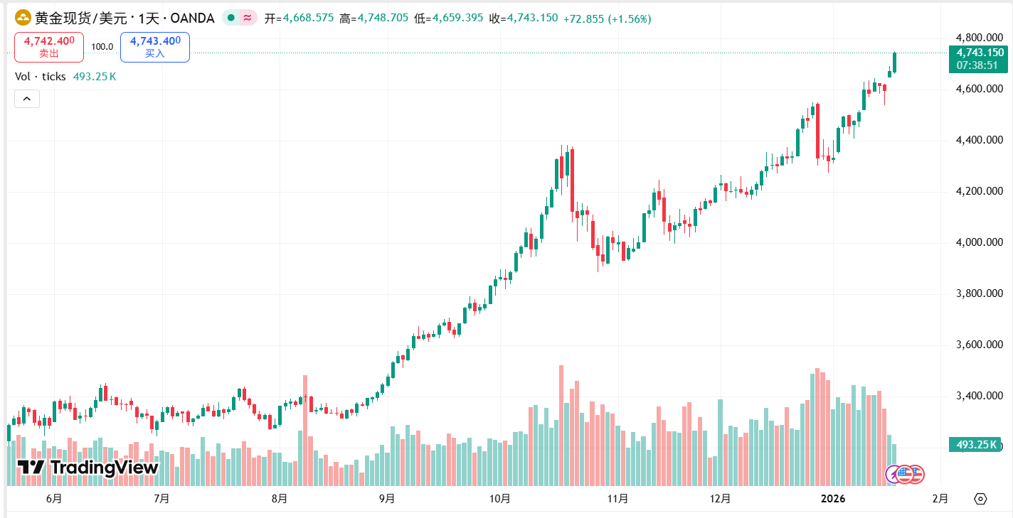 Gold breaks through $4,740 to hit a new all-time high! The Polish central bank announces an additional 150 tons of gold reserves, and rising risk aversion boosts gold prices to soar.