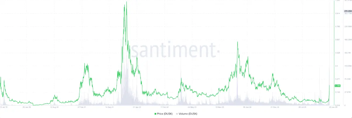 Not only OI, but data from Santiment also shows that trading volume across the entire DUSK ecosystem — aggregated from all on-chain applications — reached a record $298.43 million on Monday and remained around $264.16 million on Tuesday. This trading volume explosion demonstrates high interest and liquidity from traders, reinforcing strong bullish prospects for DUSK.