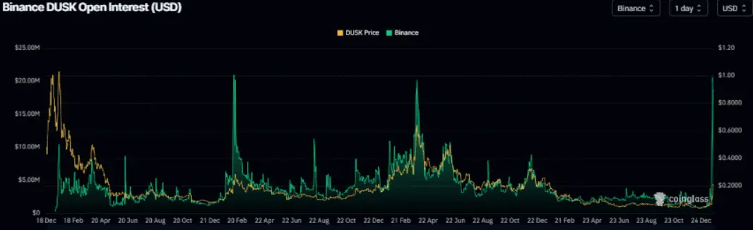 Open contract volume of DUSK across all exchanges | Source: Coinglass Open interest volume chart (OI) of DUSK futures on Binance | Source: Coinglass