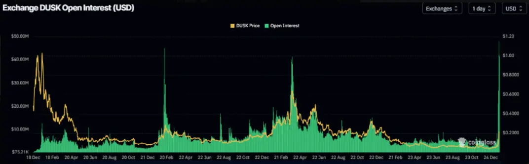 Tuesday, the DUSK (DUSK) price continued to stay above $0.20, after recording an impressive increase of over 31% on Monday. This privacy-focused cryptocurrency surged more than 1.75 times just last week, as open interest (OI) and trading volume hit a historic high. This momentum was further reinforced when DUSK announced a partnership with Chainlink (LINK) on Monday, opening cross-chain interaction possibilities for tokenized real-world assets, while also confirming the increasing long-term application potential of this coin.