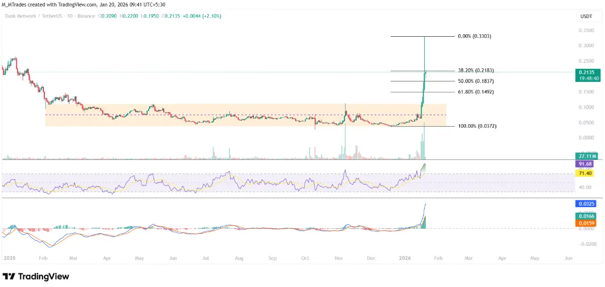 However, the daily RSI has spiked to 91, signaling extreme overbought conditions, which implies short-term correction or consolidation risks. The MACD remains bullish, supporting a positive outlook, but if DUSK faces selling pressure, the price could retreat to the 50% support zone around $0.18.