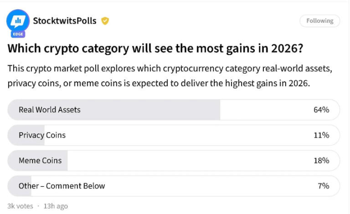 Recent Stocktwits polls show: 64% of investors believe RWA will deliver the strongest returns in 2026, far surpassing Meme coins at 12% and privacy coins at 8%. But behind this number lies a question—when retail investors all start shouting to allocate to RWA, is it a genuine upgrade in awareness or just PTSD from Meme market collapse in 2025?