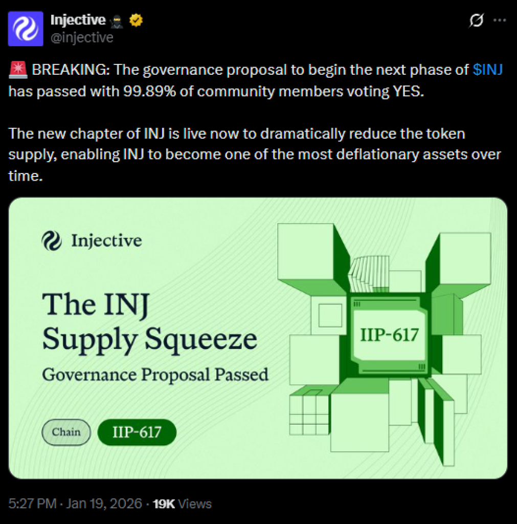 On January 19, Injective’s community approved a tokenomics update through a governance proposal, which passed with overwhelming 99.89% support. Dubbed “Supply Squeeze”, the proposal will reduce INJ issuance while maintaining the protocol’s buyback-and-burn mechanism.