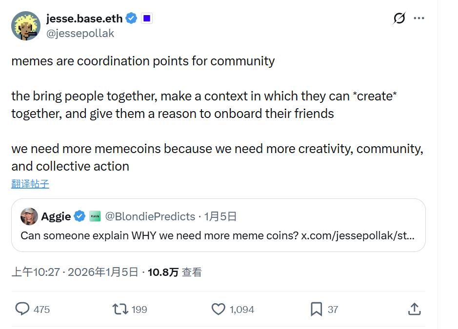 Jesse Pollak, founder of Base chain, offers an interesting perspective. He emphasizes multiple times that Meme is not just a speculative tool but also the “core of on-chain culture.” Through images, videos, music, and other content forms, Meme can attract millions of new users on-chain, becoming an entry point for large-scale Web3 adoption.