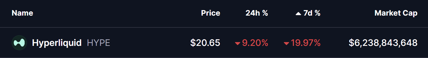 Hyperliquid’s native token, HYPE, remains under sustained selling pressure as bearish momentum continues to dominate short-term price action. As of January 21, HYPE is trading nearly 9% lower on the day, extending its weekly decline to over 19%. The token is currently hovering around the $20.65 region, an area that is quickly becoming a decisive technical battleground.