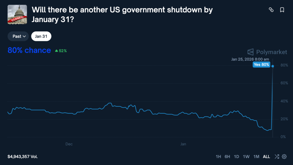 Currently, according to Polymarket data, the market bets an 80% chance that the US government will shut down again on January 31.