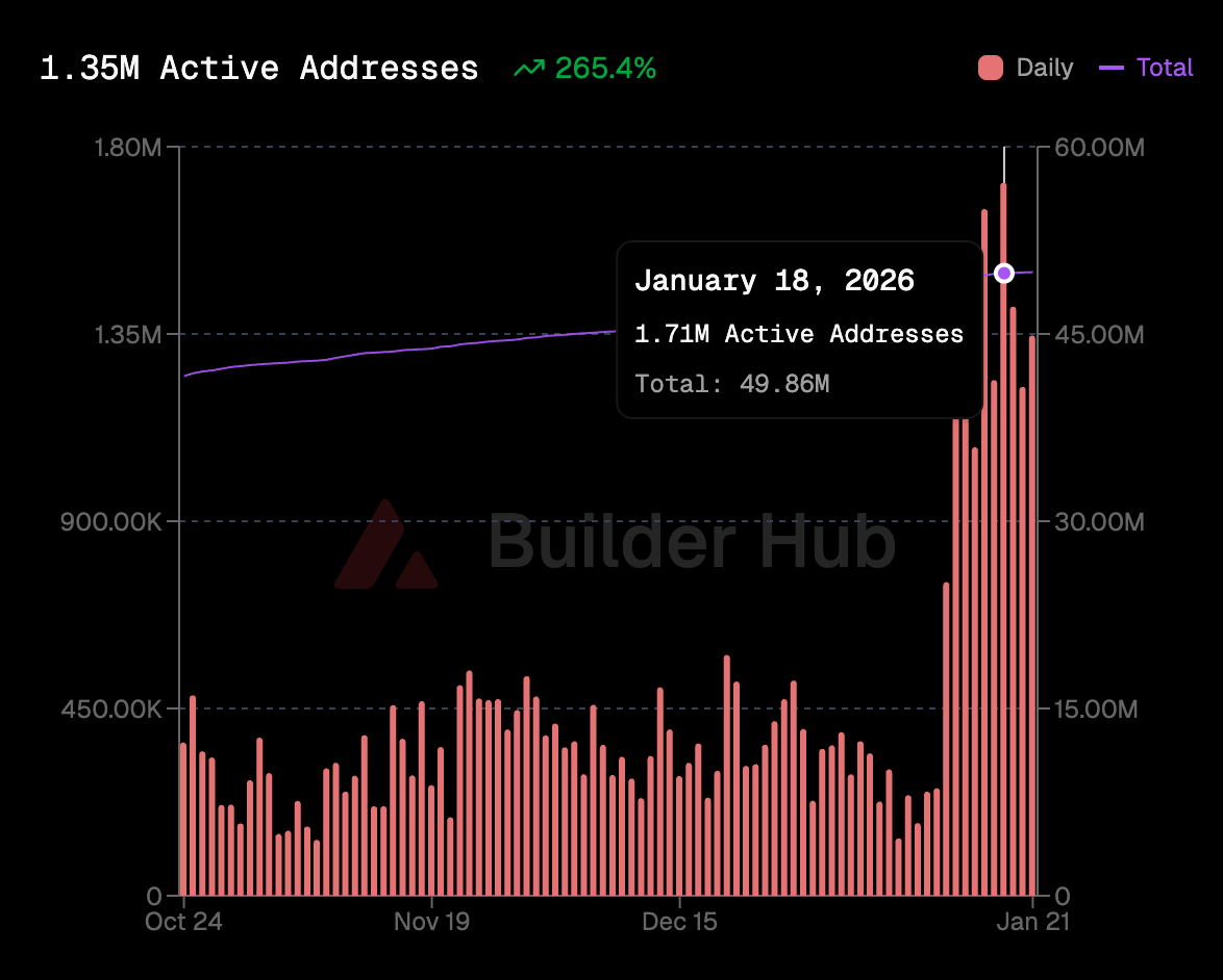 Entering the new year, Avalanche continued its growth momentum from late 2025, with its main network (primarily C-Chain, along with P-Chain and X-Chain) hitting new daily active address records, peaking at 1.71 million on January 18.