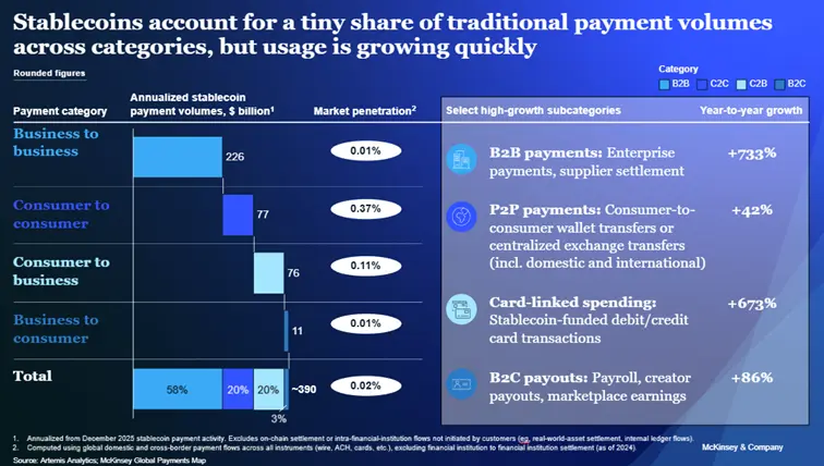 To eliminate interference and more accurately assess stablecoin payment volume, McKinsey collaborated with leading blockchain analytics provider Artemis Analytics. The analysis shows: