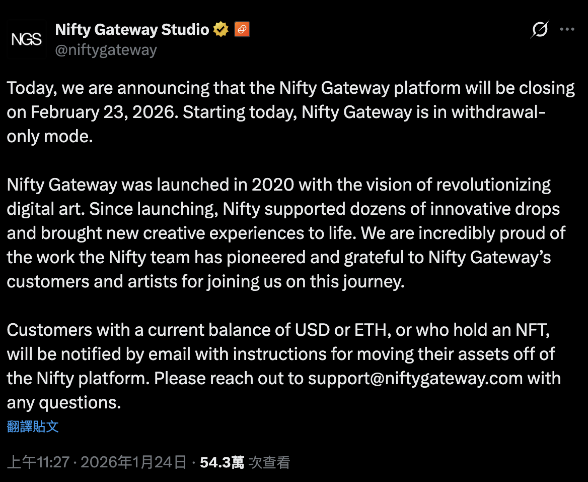 Image source: X/@niftygateway One of the representatives of the NFT wave, Nifty Gateway, officially announces that the platform will cease operations entirely on February 23, 2026